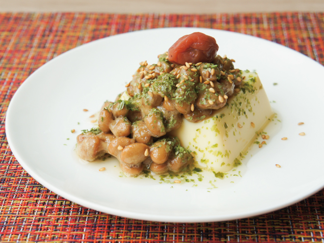 青のりごま梅納豆たまご豆腐 材料納豆(丹念納豆)、青のり、ごま、梅、たまご豆腐青のりごま梅納豆たまご豆腐の作り方①たまご豆腐を盛りつけたら、よく混ぜた納豆をかけます。②青のりとごまをかけたら、梅をのせて完成です。