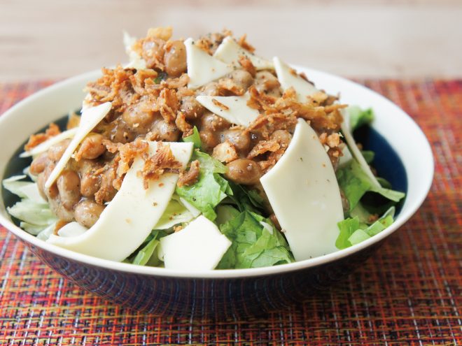 スパイス納豆オニオンチーズサラダ 材料納豆(丹念納豆)、レタス、キャベツ、スライスチーズ、フライドオニオン、万能スパイス、オリーブオイル、ポン酢スパイス納豆オニオンチーズサラダの作り方①レタスとキャベツは、食べやすい大きさに切ったら、器に盛りつけます。②オリーブオイル、ポン酢、よく混ぜた納豆をかけます。③スライスチーズを食べやすい大きさにちぎってのせたら、フライドオニオン、万能スパイスをかけて完成です。