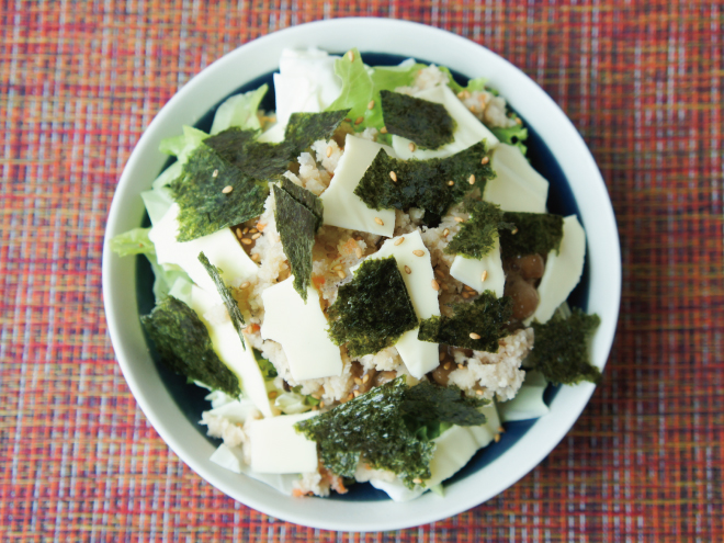 のりチーズ納豆卯の花サラダ 材料納豆(丹念納豆)、レタス、キャベツ、卯の花、スライスチーズ、味付け海苔、ごま、オリーブオイル、ポン酢のりチーズ納豆卯の花サラダの作り方①レタスとキャベツは、食べやすい大きさに切ったら、器に盛りつけます。②オリーブオイル、ポン酢、よく混ぜた納豆をかけます。③卯の花を盛り付けたら、ごまとスライスチーズ、味付け海苔をちぎってかけて完成です。