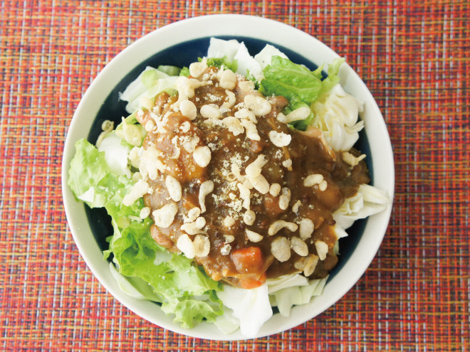 納豆天かすチーズカレーサラダ 材料納豆(丹念納豆)、レタス、キャベツ、カレー、天かす、粉チーズ、オリーブオイル納豆天かすチーズカレーサラダの作り方①レタスとキャベツは、食べやすい大きさに切ったら、器に盛りつけます。②オリーブオイル、よく混ぜた納豆をかけます。③カレーをかけたら、天かす、粉チーズをかけて完成です。
