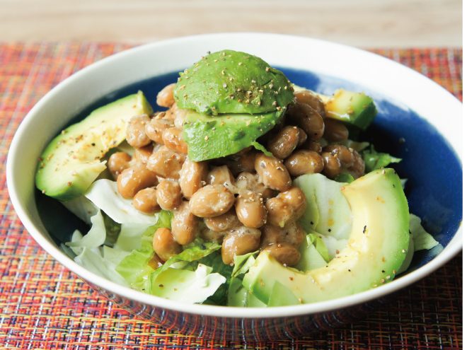 アボカド納豆オリーブスパイスサラダ 材料納豆(丹念納豆)、レタス、キャベツ、アボカド、万能スパイス、オリーブオイル、ポン酢アボカド納豆オリーブスパイスサラダの作り方①レタスとキャベツは、食べやすい大きさに切ったら、器に盛りつけます。②オリーブオイル、ポン酢、よく混ぜた納豆をかけます。③アボカドを盛り付けたら、万能スパイスをかけて完成です。