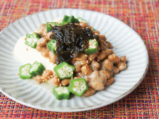 オクラもずく胡麻納豆たまご豆腐 材料納豆(丹念納豆)、たまご豆腐、オクラ、もずく、ごまオクラもずく胡麻納豆たまご豆腐の作り方①たまご豆腐を盛り付けたら、よく混ぜた納豆をかけます。②オクラ、もずく、ごまをかけて完成です。