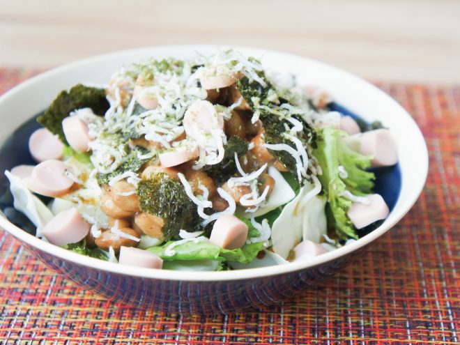 海苔じゃこ納豆ソーセージサラダ 材料納豆(丹念納豆)、レタス、キャベツ、味付け海苔、魚肉ソーセージ、ちりめんじゃこ、青のり、オリーブオイル、ポン酢海苔じゃこ納豆ソーセージサラダの作り方①レタスとキャベツは、食べやすい大きさに切ったら、器に盛りつけます。②オリーブオイル、ポン酢、よく混ぜた納豆をかけます。③味付け海苔をちらしたら、輪切りにしたソーセージをかけます。④ちりめんじゃこ、青のりをかけて完成です。