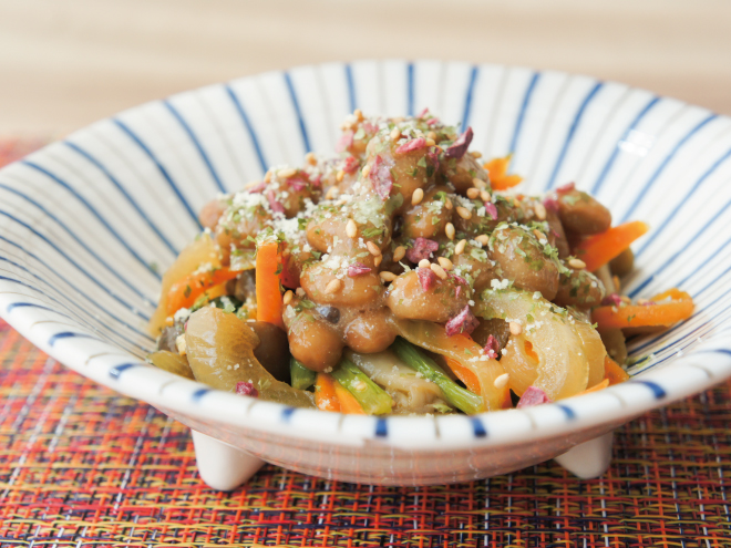 梅チーズ納豆野菜炒め 材料納豆(丹念納豆)、にんじん、しめじ、小松菜、玉ねぎ、焼き肉のたれ、粉チーズ、青のり、いりごま、カリカリ梅ふりかけ梅チーズ納豆野菜炒めの作り方①にんじん、しめじ、小松菜、玉ねぎを食べやすい大きさにカットします。②フライパンに油を引いて、①を炒め、焼肉のたれで味付けをします。③お皿に、②の野菜炒めを盛り付けたら、よく混ぜた納豆をかけます。④粉チーズ、青のり、いりごま、カリカリ梅ふりかけをかけて完成です。