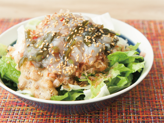 納豆(丹念納豆)、レタス、キャベツ、かつおぶし、たこわさ、いりごま、オリーブオイル