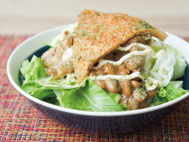 納豆(丹念納豆)、レタス、キャベツ、味付けあげ、一味唐辛子、青のり、マヨネーズ、オリーブオイル