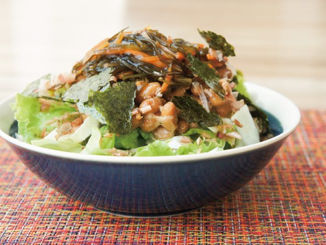 納豆(丹念納豆)、レタス、キャベツ、松前漬け、かつおぶし、味付け海苔、オリーブオイル