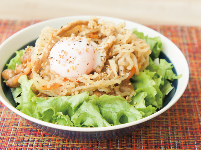 胡麻スパイス納豆切干大根温玉サラダ 材料納豆(丹念納豆)、レタス、キャベツ、切干大根、温泉卵、万能スパイス、ごま、オリーブオイル胡麻スパイス納豆切干大根温玉サラダの作り方①レタスとキャベツは、食べやすい大きさに切ったら、器に盛りつけます。②オリーブオイル、よく混ぜた納豆をかけます。③切干大根を盛り付けたら、温泉卵をのせます。④万能スパイス、ごまをかけたら完成です。