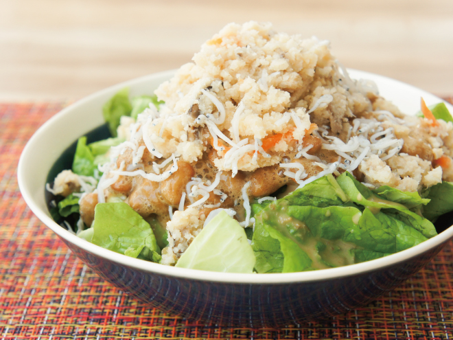 納豆(丹念納豆)、レタス、キャベツ、卯の花、ちりめんじゃこ、ごまだれ