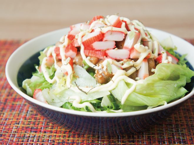 納豆(丹念納豆)、レタス、キャベツ、かにかま、マヨネーズ、ゆずふりかけ、オリーブオイル、粗挽き塩こしょう