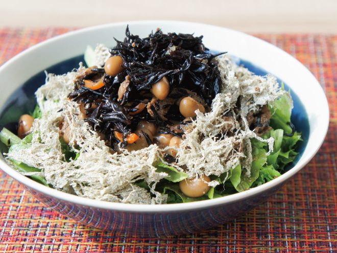 とろろ昆布スパイス納豆ひじきサラダ 材料納豆(丹念納豆)、レタス、キャベツ、ひじき煮、とろろ昆布、スパイス、オリーブオイルとろろ昆布スパイス納豆ひじきサラダの作り方①レタスとキャベツは、食べやすい大きさに切ったら、器に盛りつけます。②オリーブオイル、よく混ぜた納豆をかけます。③ひじき煮を盛り付けたら、とろろ昆布、スパイスをかけて完成です。