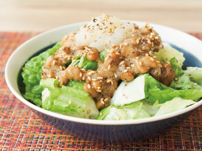 ②オリーブオイル、ポン酢、よく混ぜた納豆をかけます。
