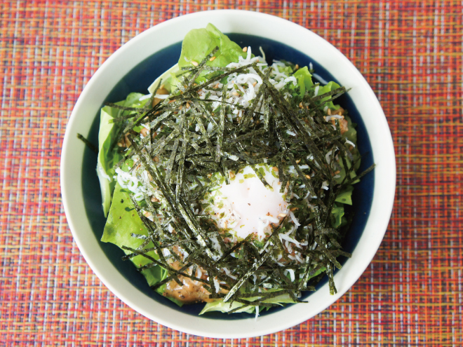温玉じゃこスパイス納豆あおさ海苔サラダ 材料納豆(丹念納豆)、レタス、キャベツ、温泉卵、ちりめんじゃこ、ごま、あおさ、スパイス、刻み海苔、オリーブオイル温玉じゃこスパイス納豆あおさ海苔サラダの作り方①レタスとキャベツは、食べやすい大きさに切ったら、器に盛りつけます。②オリーブオイル、よく混ぜた納豆をかけます。③温泉卵をのせたら、ちりめんじゃこ、ごま、あおさ、スパイス、刻み海苔をかけて完成です。