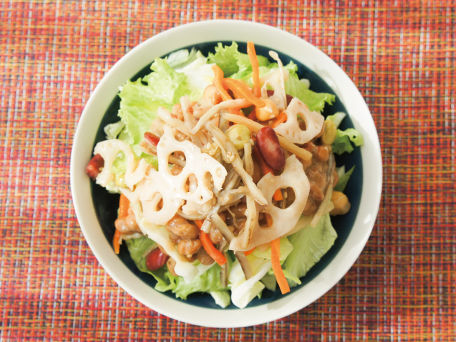 納豆れんこん彩りサラダ 材料納豆(丹念納豆)、レタス、キャベツ、れんこん彩りサラダ(惣菜)、オリーブオイル納豆れんこん彩りサラダの作り方①レタスとキャベツは、食べやすい大きさに切ったら、器に盛りつけます。②オリーブオイル、よく混ぜた納豆をかけます。③れんこん彩りサラダを盛り付けたら完成です。