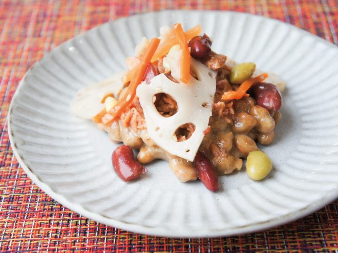 かつおフレーク納豆レンコン彩りサラダ 材料納豆(丹念納豆)、かつおフレーク味付け缶詰、レンコン彩りサラダかつおフレーク納豆レンコン彩りサラダの作り方①よく混ぜた納豆を盛り付けたら、かつおフレークをかけます。②レンコン彩りサラダをかけたら完成です。