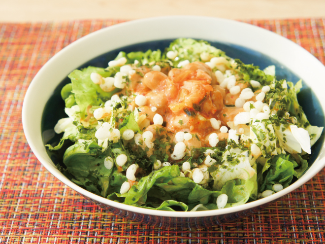 天かす青のり卵納豆えんがわチャンジャサラダ 材料納豆(丹念納豆)、レタス、キャベツ、えんがわチャンジャ、卵、天かす、青のり、ポン酢天かす青のり卵納豆えんがわチャンジャサラダの作り方①レタスとキャベツは、食べやすい大きさに切ったら、器に盛りつけます。②よく混ぜた納豆に、卵、えんがわチャンジャを混ぜて、サラダに盛り付けます。③天かす、青のり、ポン酢をかけたら完成です。