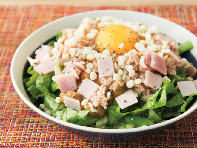 スパイス天玉ハム納豆シーチキンサラダ 材料納豆(丹念納豆)、レタス、キャベツ、シーチキン、卵、ハム、天かす、万能スパイス、オリーブオイルスパイス天玉ハム納豆シーチキンサラダの作り方①レタスとキャベツは、食べやすい大きさに切ったら、器に盛りつけます。②オリーブオイル、よく混ぜた納豆をかけます。③シーチキンを盛り付けたら、たまごをのせます。④小さく切ったハムを散らしたら、天かす、スパイスをかけて完成です。