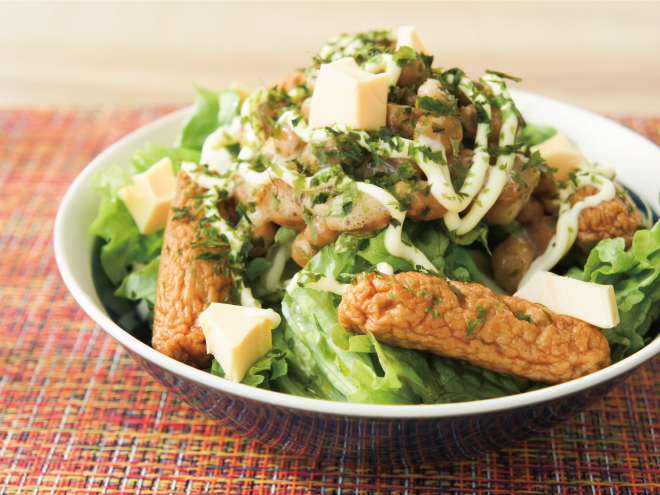 チーズ海苔マヨ納豆さつまあげサラダ 材料納豆(丹念納豆)、レタス、キャベツ、さつまあげ、マヨネーズ、あおさ、スモークチーズ、オリーブオイルチーズ海苔マヨ納豆さつまあげサラダの作り方①レタスとキャベツは、食べやすい大きさに切ったら、器に盛りつけます。②オリーブオイル、よく混ぜた納豆をかけます。③さつま揚げを盛り付けたら、マヨネーズ、あおさをかけます。④最後にスモークチーズを散らして完成です。