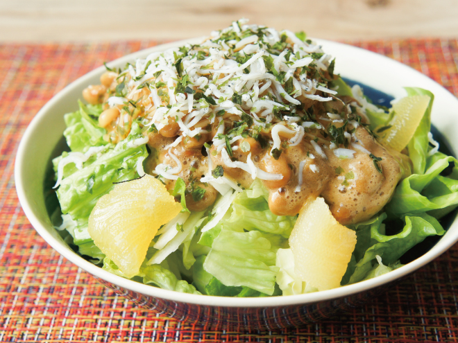 なめ茸じゃこ海苔納豆数の子サラダ 材料納豆(丹念納豆)、レタス、キャベツ、なめ茸、ちりめんじゃこ、あおさ、数の子、オリーブオイルなめ茸じゃこ海苔納豆数の子サラダの作り方①レタスとキャベツは食べやすい大きさに切ったら、器に盛りつけます。②オリーブオイル、よく混ぜた納豆をかけます。③なめ茸、ちりめんじゃこをかけたら、数の子を盛り付けます。④最後に、あおさを散らして完成です。
