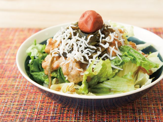 子持ちメカブ梅納豆じゃこ玉ねぎサラダ 材料納豆(丹念納豆)、レタス、キャベツ、子持ちメカブ、ちりめんじゃこ、梅、玉ねぎドレッシング、オリーブオイル子持ちメカブ梅納豆じゃこ玉ねぎサラダの作り方①レタスとキャベツは、食べやすい大きさに切ったら、器に盛りつけます。②オリーブオイル、よく混ぜた納豆をかけます。③子持ちメカブ、ちりめんじゃこ、玉ねぎドレッシングをかけたら、梅をのせて完成です。