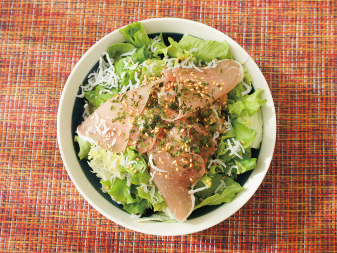 ③生ハムをのせたら、ごま、青のり、ちりめんじゃこをかけて完成です。