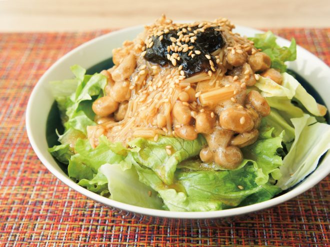 なめ茸ごま海苔ゆず納豆サラダ 材料納豆(丹念納豆)、レタス、キャベツ、なめ茸、海苔の佃煮、ごま、ゆずドレッシングなめ茸ごま海苔ゆず納豆サラダの作り方①レタスとキャベツは、食べやすい大きさに切ったら、器に盛りつけます。②よく混ぜた納豆をかけます。③なめ茸、海苔の佃煮、ごま、ゆずドレッシングをかけて完成です。