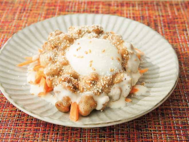 にんじん温玉チーズ納豆シーザーサラダ 材料納豆(丹念納豆)、にんじん、温泉卵、粉チーズ、ごま、シーザードレッシングにんじん温玉チーズ納豆シーザーサラダの作り方①にんじんは、食べやすい大きさに切ったら、器に盛りつけます。②よく混ぜた納豆をかけたら、真ん中をくぼませて、温泉卵をのせます。③粉チーズ、ごま、シーザードレッシングをかけたら完成です。