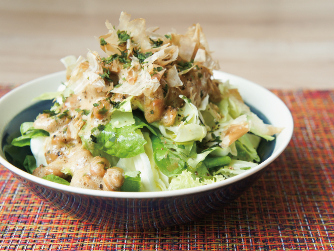 青のり鰹オリーブスパイス納豆サラダ 材料納豆(丹念納豆)、レタス、キャベツ、オリーブオイル、スパイス、かつおぶし、青のり青のり鰹オリーブスパイス納豆サラダの作り方①レタスとキャベツは、食べやすい大きさに切ったら、器に盛りつけます。②よく混ぜた納豆、オリーブオイルをかけます。③スパイス、かつおぶし、青のりをかけたら完成です。