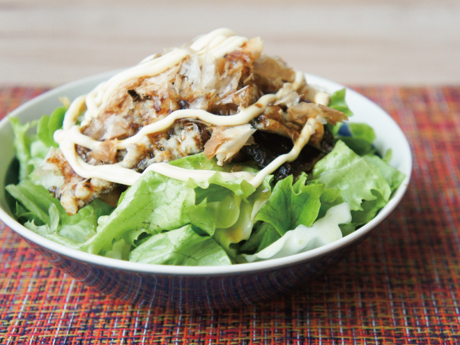 ③のり天をのせたら、かつおぶし、マヨネーズ、しょうゆをかけて完成です。