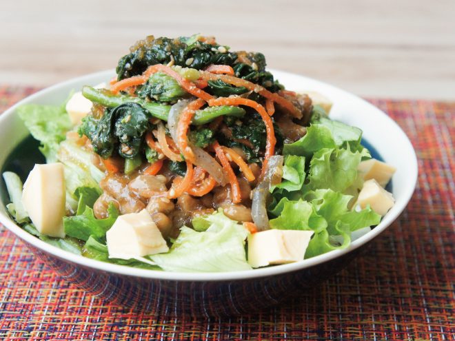 納豆チーズ菜の花の胡麻和えオニオンサラダ 材料納豆(丹念納豆)、レタス、キャベツ、菜の花の胡麻和え、スモークチーズ、オニオンドレッシング納豆チーズ菜の花の胡麻和えオニオンサラダの作り方①レタスとキャベツは、食べやすい大きさに切ったら、器に盛りつけます。②よく混ぜた納豆をかけたら、菜の花の胡麻和えをのせます。③スモークチーズをちぎって散らしたら、オニオンドレッシングをかけて完成です。