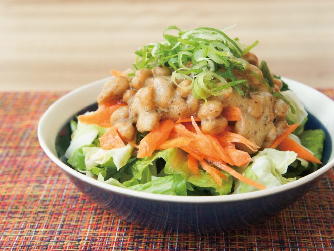 梅大葉ねぎ納豆サラダ 材料納豆(丹念納豆)、レタス、キャベツ、にんじん、ブロッコリー、ねぎ、梅大葉ドレッシング梅大葉ねぎ納豆サラダの作り方①ブロッコリーは、塩茹でして、水気を切っておきます。②レタス、キャベツ、にんじん、ブロッコリーは、食べやすい大きさに切ったら、器に盛りつけます。③よく混ぜた納豆をかけたら、ねぎをのせます。④梅大葉ドレッシングをかけたら完成です。