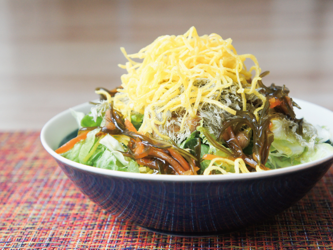 とろろ昆布納豆と松前漬け錦糸卵サラダ 材料納豆(丹念納豆)、レタス、キャベツ、とろろ昆布、錦糸卵、松前漬け、オリーブオイルとろろ昆布納豆と松前漬け錦糸卵サラダの作り方①レタスとキャベツは、食べやすい大きさに切ったら、器に盛りつけます。②よく混ぜた納豆、とろろ昆布をかけます。③錦糸卵をのせたら、オリーブオイル、松前漬けをかけて完成です。