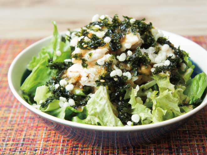 ③ささみを盛り付けて、韓国のり、天かす、オニオンドレッシングをかけたら完成です。