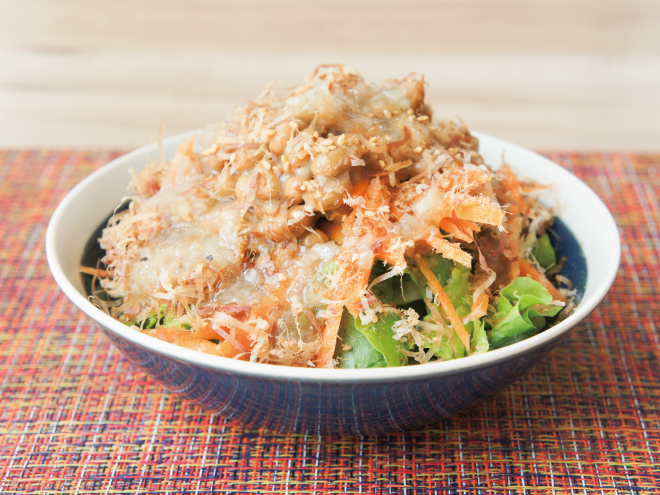 納豆(丹念納豆)、レタス、キャベツ、ニンジン、かつおぶし、ごま、レモンオニオンドレッシング