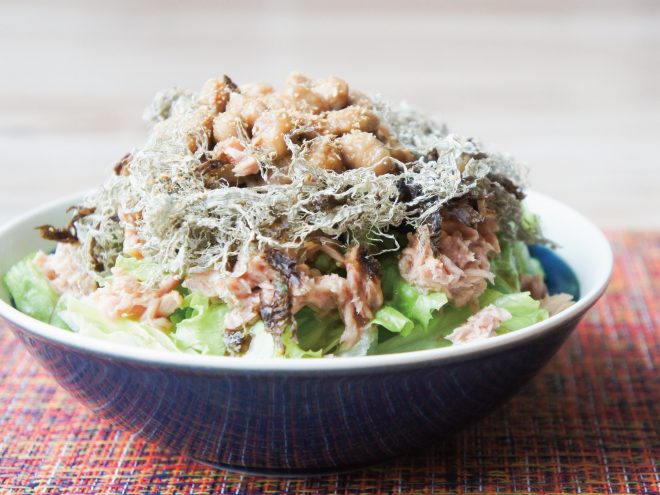 とろろ昆布のりごま納豆シーチキントリュフサラダ 材料納豆(丹念納豆)、レタス、キャベツ、シーチキン、トリュフドレッシング、とろろ昆布、すりごまとろろ昆布のりごま納豆シーチキントリュフサラダの作り方①レタスとキャベツは、食べやすい大きさに切ったら、器に盛りつけます。②よく混ぜた納豆、シーチキン、トリュフドレッシングをかけます。③とろろ昆布と海苔、そしてすりごまをかけたら完成です。