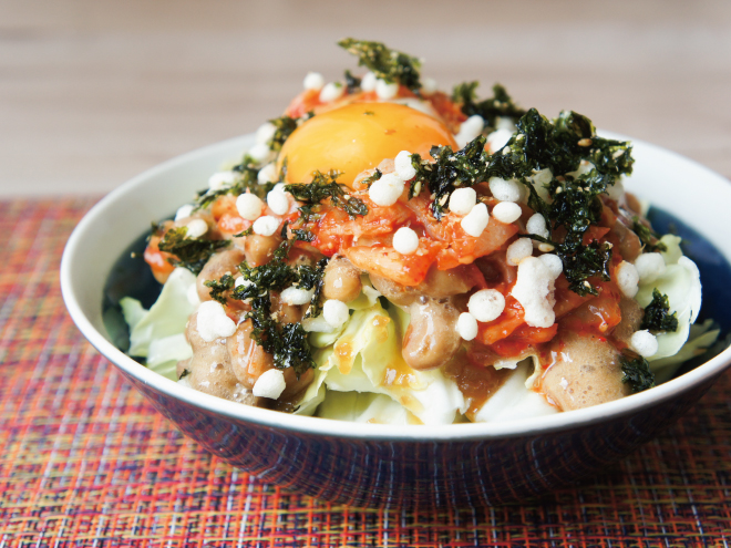 天玉キムチ韓国のり納豆オニオンサラダ 材料納豆(丹念納豆)、レタス、キャベツ、キムチ、たまご、天かす、韓国のり、すりごま、オニオンドレッシング天玉キムチ韓国のり納豆オニオンサラダの作り方①レタスとキャベツは、食べやすい大きさに切ったら、器に盛りつけます。②よく混ぜた納豆をかけたら、キムチをのせます。③真ん中にくぼみを作って、たまごを落とします。④天かす、韓国のり、すりごま、オニオンドレッシングをかけたら完成です。