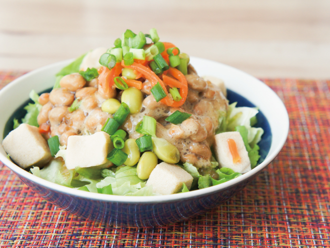 彩り高野とうふ納豆ねぎオニオンサラダ 材料納豆(丹念納豆)、レタス、キャベツ、彩りこうや(そうざい)、ねぎ、オニオンドレッシング彩り高野とうふ納豆ねぎオニオンサラダの作り方①レタスとキャベツは、食べやすい大きさに切ったら、器に盛りつけます。②よく混ぜた納豆をかけたら、彩りこうやをのせます。③刻んだねぎと、オニオンドレッシングをかけたら完成です。