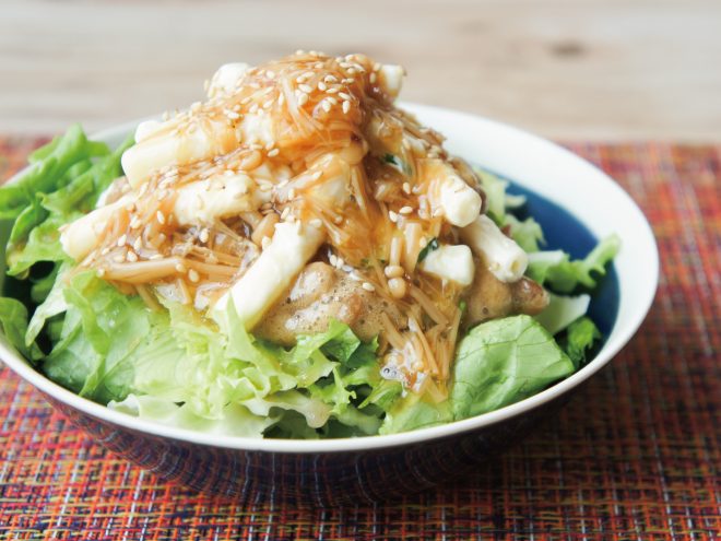 納豆マカロニなめ茸ごまウメサラダ 材料納豆(丹念納豆)、レタス、キャベツ、マカロニサラダ、なめ茸、ごま、オリーブオイル、梅しそドレッシング納豆マカロニなめ茸ごまウメサラダの作り方①レタスとキャベツは、食べやすい大きさに切ったら、器に盛りつけます。②よく混ぜた納豆をかけたら、オリーブオイルをかけます。③マカロニサラダをのせたら、なめ茸、ごま、梅しそドレッシングをかけて完成です。