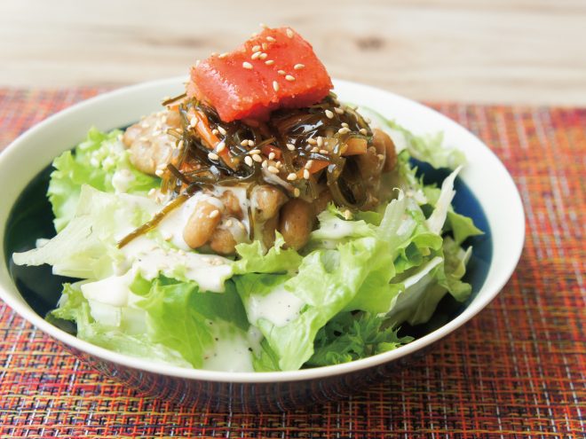 松前漬け納豆チーズ明太子サラダ 材料納豆(丹念納豆)、レタス、キャベツ、松前漬け、明太子、ごま、3種のチーズドレッシング松前漬け納豆チーズ明太子サラダの作り方①レタスとキャベツは、食べやすい大きさに切ったら、器に盛りつけます。②よく混ぜた納豆、チーズドレッシングをかけます。③松前漬けをかけたら、明太子をのせます。④ごまをかけたら完成です。