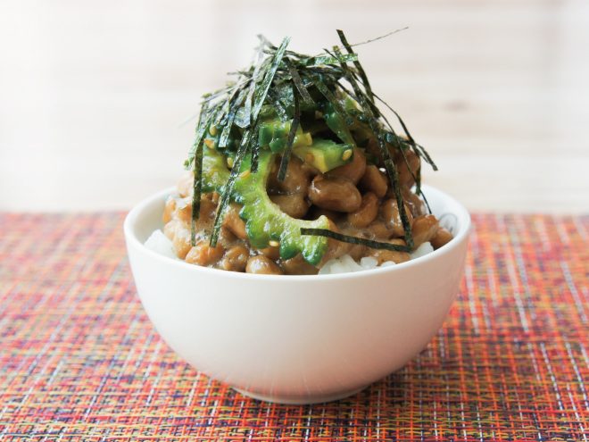 ゴーヤの浅漬け海苔納豆ご飯 材料納豆(丹念納豆)、ゴーヤ、塩、酢、砂糖、薄口醤油、濃口醤油、塩昆布、白ごま、刻み海苔、ご飯ゴーヤの浅漬け海苔納豆ご飯の作り方①ゴーヤを半分にカットしたら、中のワタを取り除いて薄切りにし、塩を振っておきます。②しばらく置いたゴーヤの水分を絞り、酢、砂糖、薄口醤油、濃口醤油、塩昆布、白ごまを加えてよく和えます。③お茶碗にご飯をついだら、よく混ぜた納豆をかけます。④ゴーヤの浅漬けをのせたら、刻み海苔をかけて完成です。