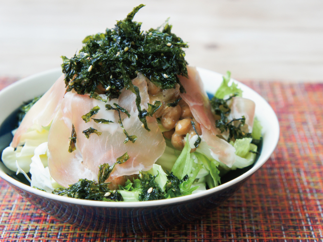 韓国のり生ハム納豆日向夏サラダ 材料納豆(丹念納豆)、レタス、キャベツ、生ハム、韓国のり、オリーブオイル、日向夏ドレッシング韓国のり生ハム納豆日向夏サラダの作り方①レタスとキャベツは、食べやすい大きさに切ったら、器に盛りつけます。②よく混ぜた納豆、オリーブオイルをかけます。③生ハムを盛り付けたら、韓国のり、日向夏ドレッシングをかけて完成です。