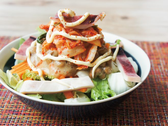 キムチ納豆一味イカ焼きマヨサラダ 材料納豆(丹念納豆)、レタス、キャベツ、キムチ、イカ焼き、マヨネーズ、一味唐辛子キムチ納豆一味イカ焼きマヨサラダの作り方①レタスとキャベツは、食べやすい大きさに切ったら、器に盛りつけます。②よく混ぜた納豆をかけたら、キムチ、イカ焼きをのせます。③マヨネーズ、一味唐辛子をかけたら完成です。