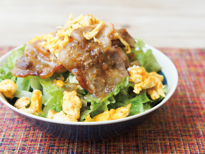 生姜焼き納豆たまごオニオンサラダ 材料納豆(丹念納豆)、レタス、キャベツ、生姜焼き、卵、オニオンドレッシング生姜焼き納豆たまごオニオンサラダの作り方①レタスとキャベツは、食べやすい大きさに切ったら、器に盛りつけます。②よく混ぜた納豆をかけたら、生姜焼きを盛り付けます。③卵を溶き、フライパンで崩しながら焼いたものと、オニオンドレッシングをかけて完成です。