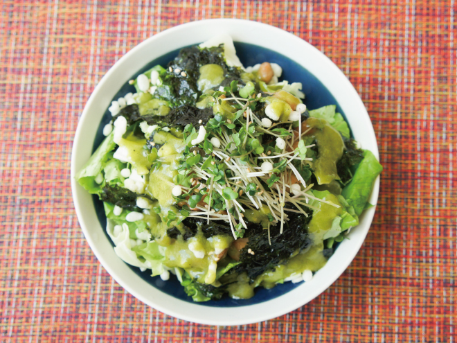 天かすゴマ海苔納豆ブロッコリースプラウトルッコラサラダ 材料納豆(丹念納豆)、レタス、キャベツ、ブロッコリースプラウト、韓国のり、天かす、ごま、ルッコラドレッシング天かすゴマ海苔納豆ブロッコリースプラウトルッコラサラダの作り方①レタスとキャベツは、食べやすい大きさに切ったら、器に盛りつけます。②よく混ぜた納豆、韓国のりをかけます。③ブロッコリースプラウトをのせたら、天かす、ごま、ルッコラドレッシングをかけて完成です。