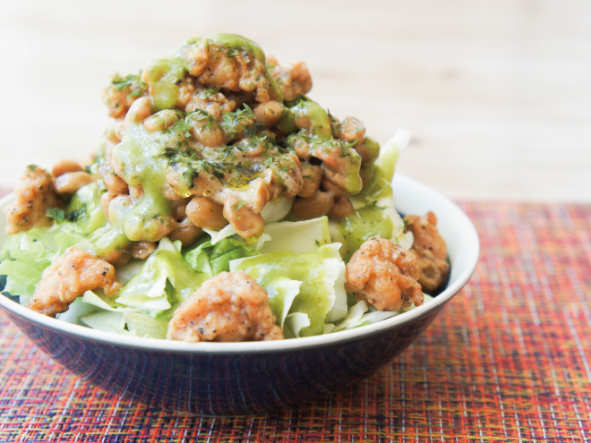 青のり納豆なんこつルッコラサラダ 材料納豆(丹念納豆)、レタス、キャベツ、軟骨唐揚げ、青のり、ルッコラドレッシング、オリーブオイル青のり納豆なんこつルッコラサラダの作り方①レタスとキャベツは、食べやすい大きさに切ったら、器に盛りつけます。②オリーブオイル、よく混ぜた納豆をかけます。③軟骨唐揚げを盛り付けて、青のり、ルッコラドレッシングをかけたら完成です。