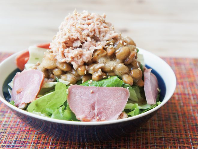 スモークタン梅しそ納豆シーチキンサラダ 材料納豆(丹念納豆)、レタス、キャベツ、シーチキン、スモークタン、ごま、梅しそドレッシングスモークタン梅しそ納豆シーチキンサラダの作り方①レタスとキャベツは、食べやすい大きさに切ったら、器に盛りつけます。②よく混ぜた納豆、シーチキンをかけたら、スモークタンを盛り付けます。③ごま、梅しそドレッシングをかけて完成です。