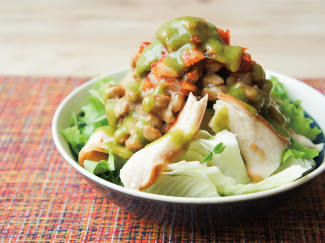 キムチ納豆スモークチキンるっこらサラダ 材料納豆(丹念納豆)、レタス、キャベツ、ブロッコリースプラウト、スモークチキン、キムチ、ルッコラドレッシングキムチ納豆スモークチキンるっこらサラダの作り方①レタス、キャベツ、ブロッコリースプラウトは、食べやすい大きさに切ったら、器に盛りつけます。②よく混ぜた納豆をかけたら、スモークチキンをのせます。③キムチを盛り付けて、ルッコラドレッシングをかけたら完成です。