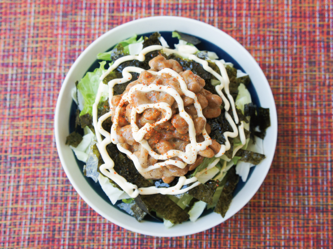 納豆(丹念納豆)、レタス、キャベツ、味付きのり、オリーブオイル、マヨネーズ、一味唐辛子