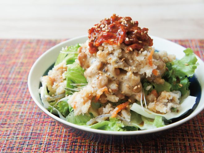 卯の花納豆タラチャンジャかぼすサラダ 材料納豆(丹念納豆)、レタス、キャベツ、ブロッコリースプラウト、卯の花、タラチャンジャ、ごま、かぼすポン酢卯の花納豆タラチャンジャかぼすサラダの作り方①レタス、キャベツ、ブロッコリースプラウトは、食べやすい大きさに切ったら、器に盛りつけます。②よく混ぜた納豆をかけたら、卯の花、タラチャンジャをのせます。③ごまと、かぼすポン酢をかけたら、完成です。