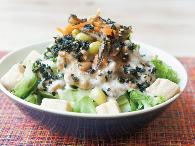 ザクザクわかめ納豆彩りこうやシーザーサラダ 材料納豆(丹念納豆)、レタス、キャベツ、ブロッコリースプラウト、彩りこうや豆腐(惣菜)、ザクザクわかめふりかけ、シーザーサラダドレッシングザクザクわかめ納豆彩りこうやシーザーサラダの作り方①レタス、キャベツ、ブロッコリースプラウトは、食べやすい大きさに切ったら、器に盛りつけます。②よく混ぜた納豆をかけたら、彩りこうやをのせます。③ザクザクわかめふりかけ、シーザーサラダドレッシングをかけたら完成です。